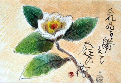 振り向く女性 庭の椿